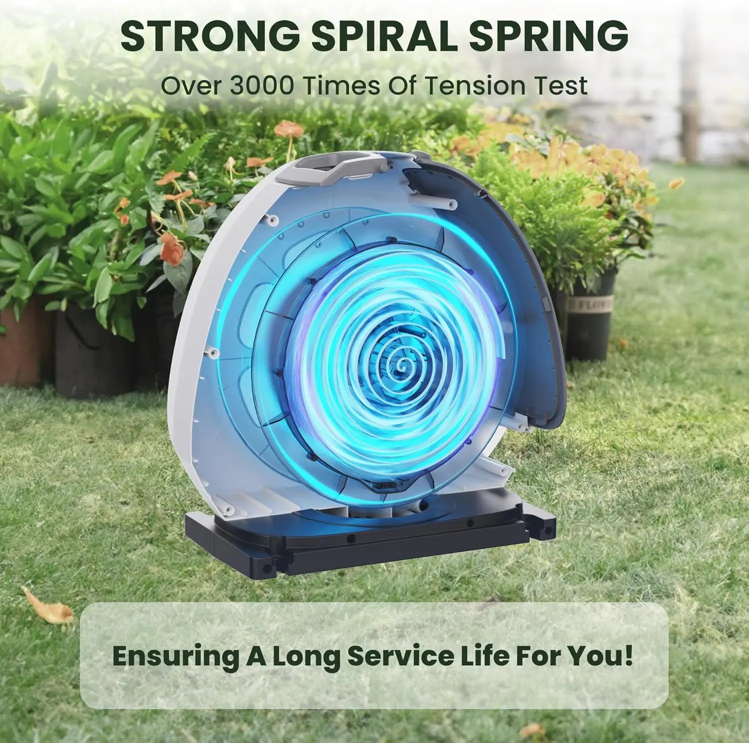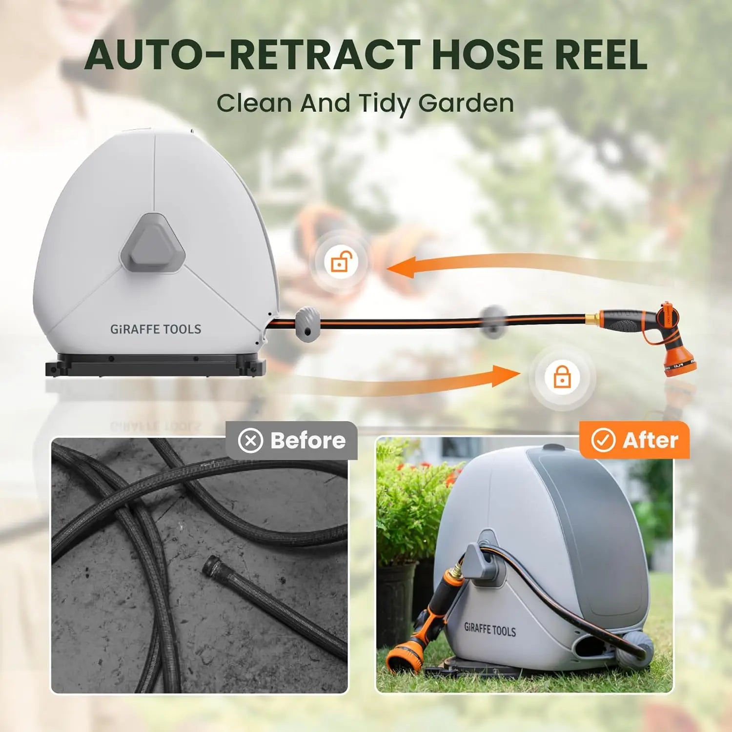 Experience effortless garden watering with the Giraffe Tools Retractable Hose Reel—auto rewind, lock-at-any-length, and neat storage in one compact system.